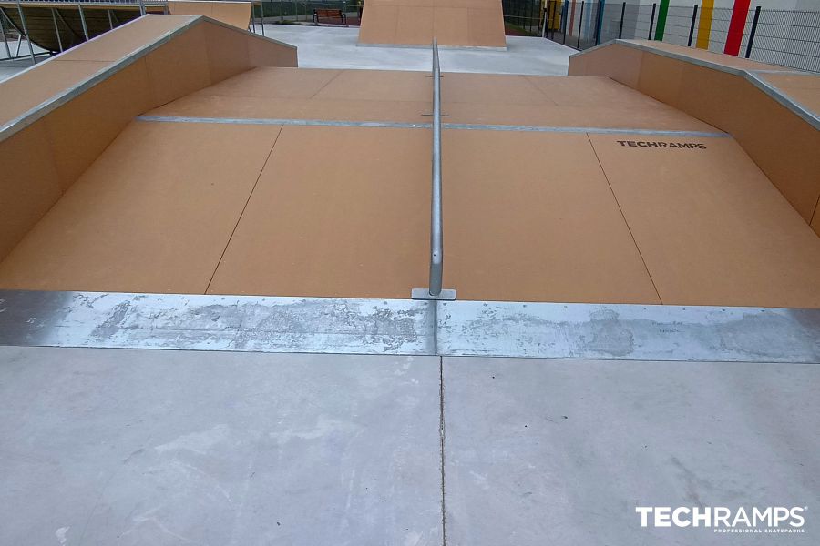 El skatepark modular STAL DELUXE de Krzeptowo es una instalación compacta de aproximadamente 44 × 18 m, diseñada para la práctica variada del street y el entrenamiento en elementos de transición. Incluye dos rampas peraltadas, un funbox con grindboxes y barandillas, y una minirampa para pilotaje en curva. La estructura es de acero galvanizado y la superficie de rodadura es una alfombra RampLine de 8 mm de grosor para una mayor durabilidad y un buen rendimiento. La disposición de los obstáculos permite carreras lineales suaves y combinaciones técnicas de trucos.