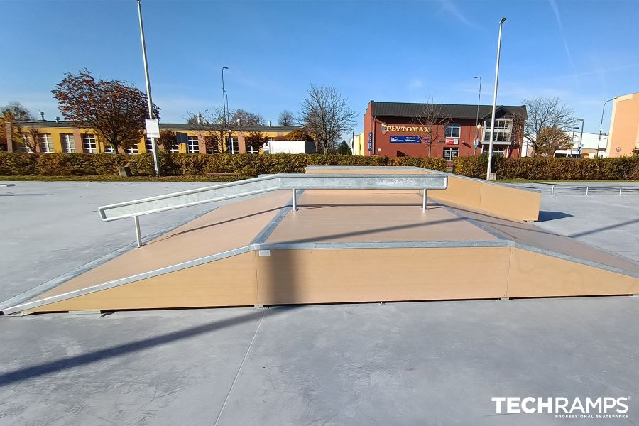 La instalación de Słupca es un conjunto de elementos modulares de la tecnología STAL DELUXE, basados en una estructura de perfiles de acero galvanizado. El sistema incluye un funbox con grindbox y pasamanos, dos grindbox, un pasamanos recto y un banco, lo que permite realizar una gran variedad de trucos callejeros y construir líneas de carrera suaves. La superficie de rodadura está fabricada con paneles HPL, lo que garantiza su durabilidad y resistencia al uso intensivo y a las condiciones meteorológicas. La estructura de acero aumenta la rigidez y la durabilidad de los elementos, al tiempo que mantiene un alto rendimiento en la conducción.