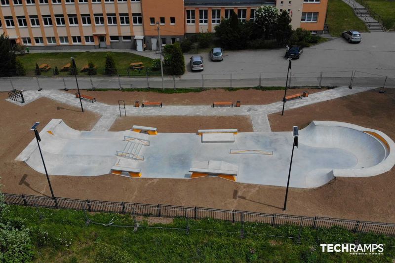 Скейтпарк в класичній прямокутній формі, виконаний у вигляді SLS. Він має дорожню платформу та відкриту чашу > ідеально підходить для початківців та просунутих.